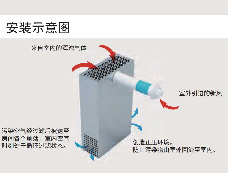 主要組成:排風口新風主機、進排風口、風管、過濾系統